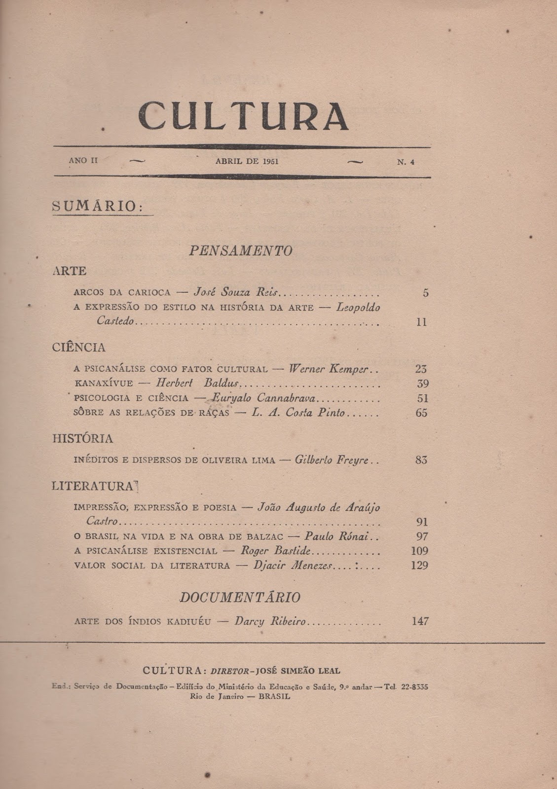 human knowledge — Euryalo Cannabrava, 199 / HISTOIRE DES techniques — L. A. Costa Pinto, 200 / OTHER VOICES, other rooms — Lê do Ivo, 201 / poemas — Jorge de Lima, 203 / court traité de l'existence et de l'existant — Fábio Alves Ribeiro, 205 / A study of poetic idiosyncrasy in relation to poetic tradition — Otto Maria Carpeaux, 207 / aparência do rio de janeiro — Roquette Pinto, 209 I provincianas — Luiz Delgado, 212 / challenge to musical tradition — Luís Cosme, 213.